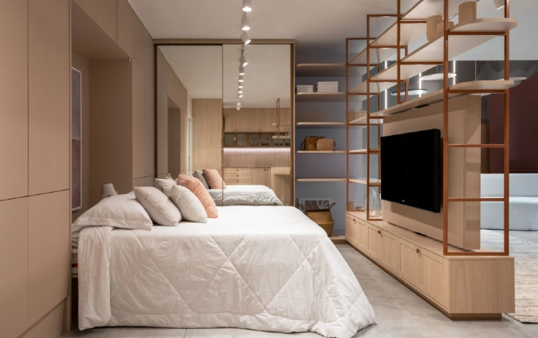 - Home office multifuncional: em um quarto pequeno, uma parede pode ser dedicada a um sistema giratório que inclui a cama e uma mesa. Isso permite que o espaço seja usado tanto como escritório quanto para dormir. E uma iluminação distribuída em vários pontos de luz proporciona uma luz suave e eficiente, tendo a densidade adaptável tanto para momentos de foco, como de relaxamento.