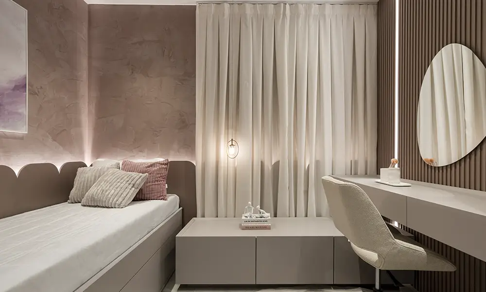 No dormitório de menina planejado, cores suaves, iluminação bem distribuída e nichos decorativos ajudam a criar um ambiente funcional e organizado, sem abrir mão da personalidade. A inclusão de espaços para estudo, armazenamento e autocuidado deve ser pensada de forma integrada, permitindo que o quarto acompanhe mudanças de rotina ao longo do tempo sem comprometer conforto ou fluidez.
